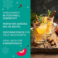 Mit dem Apfel Punsch Gewürzmix zauberst du im Handumdrehen einen köstlichen Apfelpunsch, der Groß und Klein begeistert. Diese alkoholfreie Alternative zu Glühwein ist ideal für die ganze Familie und sorgt für gemütliche Winterabende. Die Zubereitung ist so einfach: Erwärme 0,75l Apfelsaft (oder anderen Fruchtsaft) und gib einen Beutel unseres Apfelpunsch Gewürzmixes hinzu. Achte darauf, dass die Mischung nicht kocht, damit sich die Aromen voll entfalten können. Nach nur 5 Minuten ist das wärmende Wintergetränk fertig. Alle enthaltenen Bio-Zutaten stammen aus nachhaltigem Anbau. Die sorgfältig ausgewählten Früchte und Gewürze sind in kompostierbaren Pyramidenbeuteln optimal vorportioniert. Sonnengereifte Orangen, aromatischer Hibiskus und fruchtige Äpfel sorgen für einen intensiven, natürlichen Geschmack. Verfeinert mit Zimt, Nelken, Kardamom und Fenchel entfaltet der Punsch eine perfekte winterlich-weihnachtliche Note. Ein Beutel reicht für etwa 0,75l Fruchtsaft. Der Gewürzmix lässt sich auch hervorragend mit anderen Fruchtsäften kombinieren - verleihe deinen Lieblingssäften einen festlichen Touch! Ideal auch für die Zubereitung von Kinderpunsch. Auch als Wichtelgeschenk in der Vorweihnachtszeit eine tolle Überraschung.