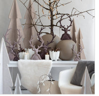 Diese bunten Bäume, Hirsche und Nikoläuse bestehen aus Kunststoff und sind rundum beflockt.
