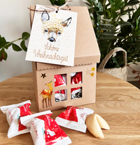 Weihnachtszeit ist die Zeit der Vorfreude, und unser limitierter Glückskeks Adventskalender macht sie noch ein bisschen zauberhafter. Statt klassischer Türchen öffnest Du Tag für Tag das Dach eines liebevoll gestalteten Papphauses und entnimmst einen handgefertigten Glückskeks. Hinter jedem Dach verbirgt sich nicht nur ein zarter Keks mit feinem Vanillegeschmack, sondern auch eine kleine weihnachtliche Botschaft, die Dir ein Lächeln ins Gesicht zaubert und den Tag mit einer Extraportion Freude beginnen lässt. So wird jeder Dezembermorgen zu einem besonderen Moment, der die Wartezeit bis Weihnachten verkürzt und gleichzeitig kleine Glücksmomente in den Alltag bringt.
